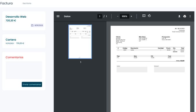 Un área segura para que tu cliente pueda ver los presupuestos que le has enviado y sus facturas, también podrá aceptar o denegar un presupuesto y si lo acepta firmarlo.
